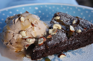 I totally love that you have a blog!! That cake looks so so good. If it is flourless it must be gooey goodness. I have had the flu for 4 days and I am sure TOMORROW I am going to be ready for some of that!! Oh and I am not a big icecream fan BUT I love this place here that has a dk. chocolate gelato. I might as well just take it and slather it right on my thighs because I know that is where it will end up LUSCIOUS!! I love and miss you !!