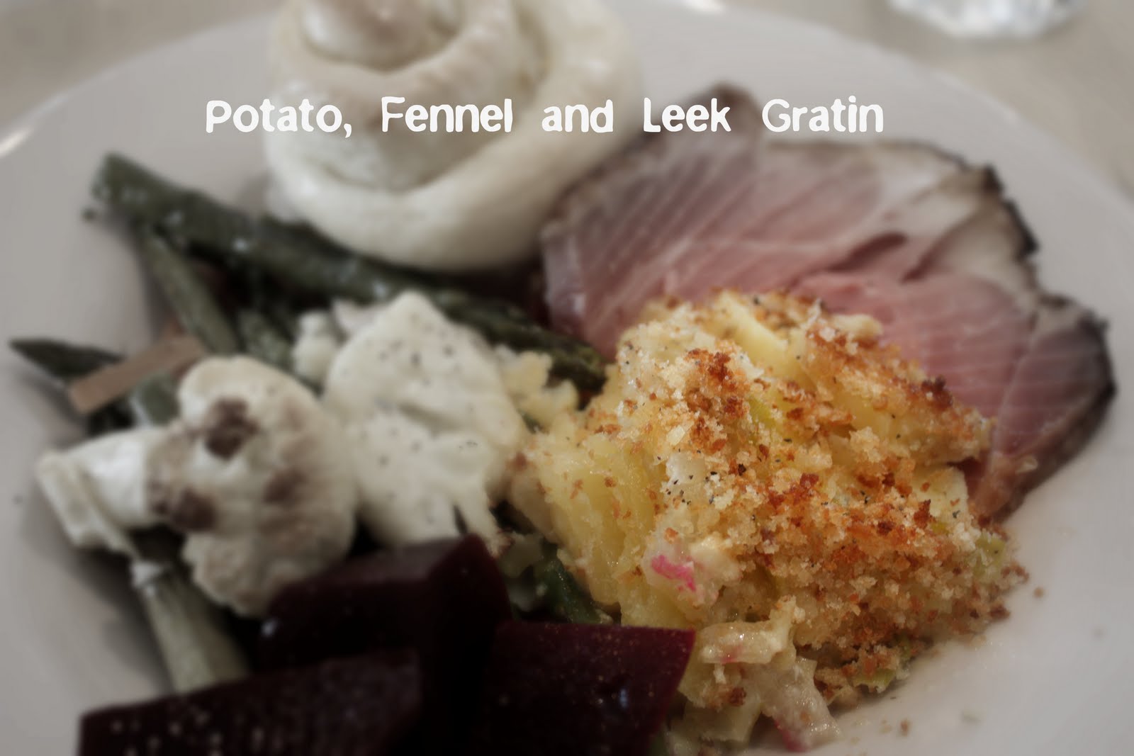 Really he still loves me most, but James loved this Potato Fennel and Leek Gratin last week. You know you’ve got a hit on your hands when hours later he makes the yummy sounds and tells me how good those potatoes were! I made it Sunday for Easter dinner after reading about a similar gratin in a magazine a few weeks ago. As a kid my mom used to make “Ahg Rotten Potatoes” and we loved them. It was usually summertime, and she’d make them in her heavy duty roaster pan. It had loads of bacon, and Velveeta in it. We loved those tators! It usually meant company was coming over to swim in our backyard and we were going to eat at the picnic table in the back yard. My childhood is all coming back! I loved those warm summer nights.