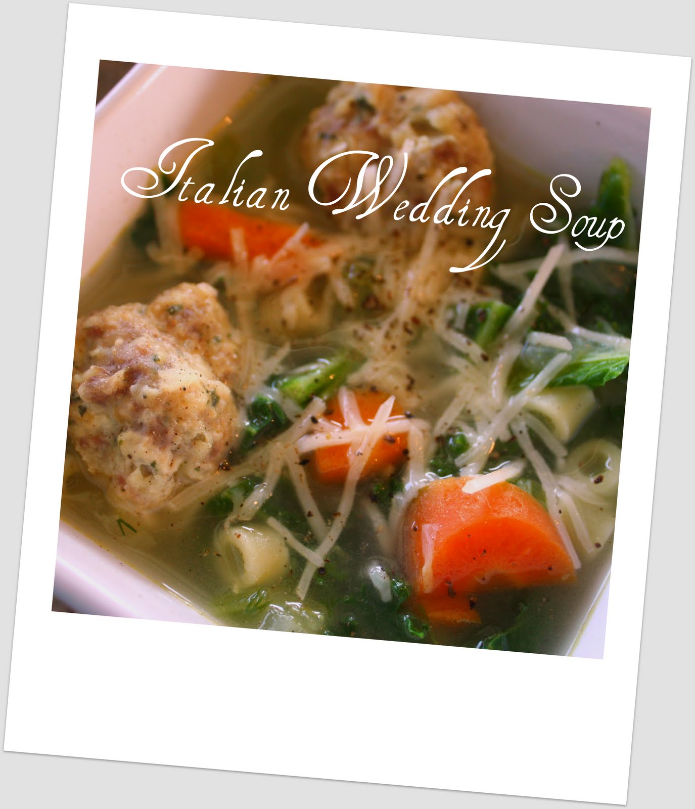 Back to Eric, in his honor today I thought I’d post this soup recipe he told me about. He had it at an in-laws home a while back, and has just been raving about it. He swears it is the best soup on the planet. I’ll have to admit it was really tasty. It comes from Ina Garten. I love her! Maybe it’s the fact that she is such a plump cheerful lady, and I’ve decided she loves food. She has the best recipes. Some of my all time favorites come from her. The recipes are usually really straight forward, and unassuming. I really need to post her Macaroons. Chocolate dipped to be exact. To die for!! The Italian Wedding Soup is wonderful. It is a very pretty soup to serve and it’s not heavy. You can eat it year round. You can always use store bought meatballs, but the homemade ones were yummy.