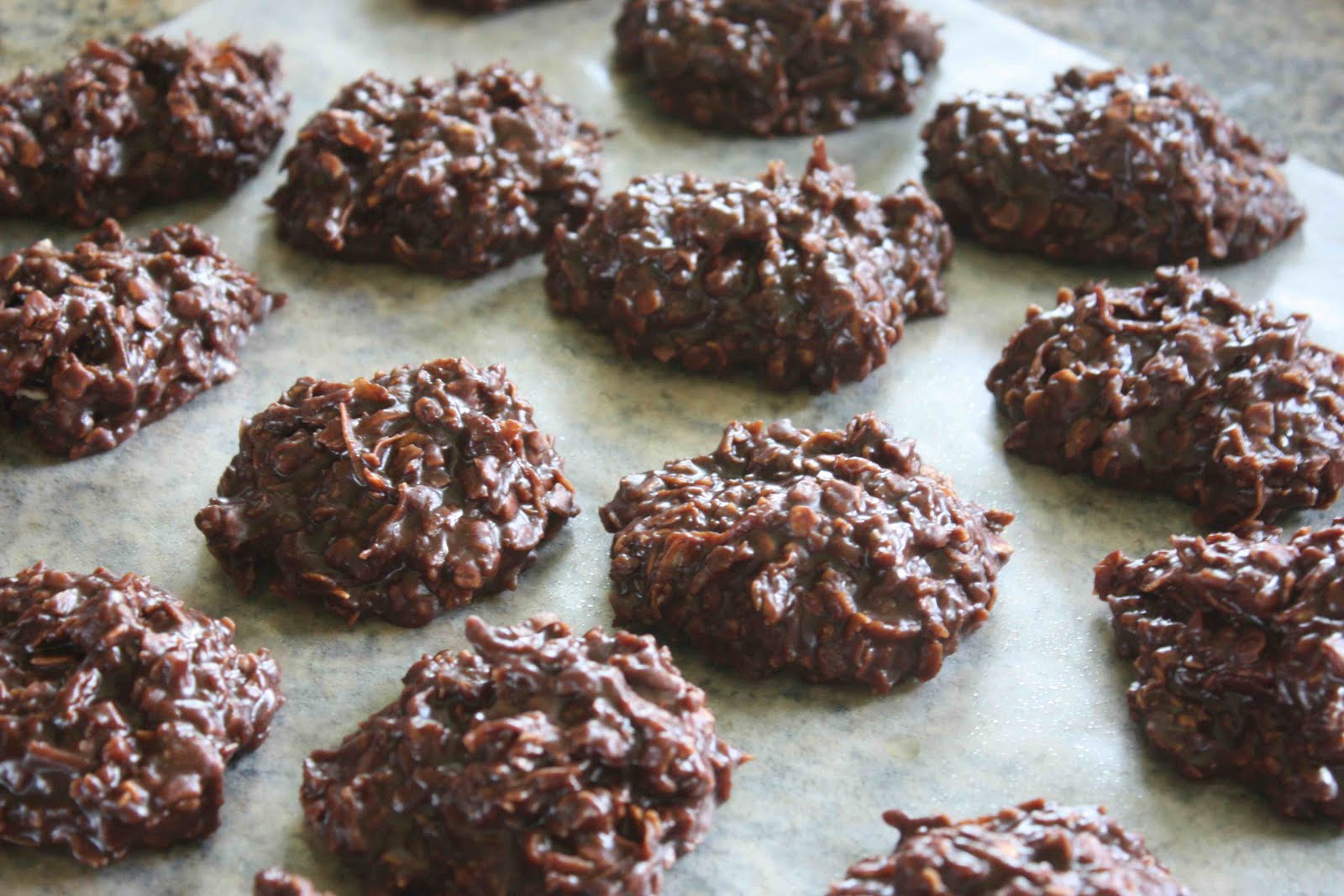 Drop mixture by spoonfuls onto waxed paper or parchment lined baking sheets or Silpat sheets. Let cool until you can touch the mixture; then reshape the cookies to make them more a ball shape if you want. Let cool completely; store at room temperature. You can also pour this mixture into a 9″ square pan that has been greased with unsalted butter, let cool, then cut into squares.