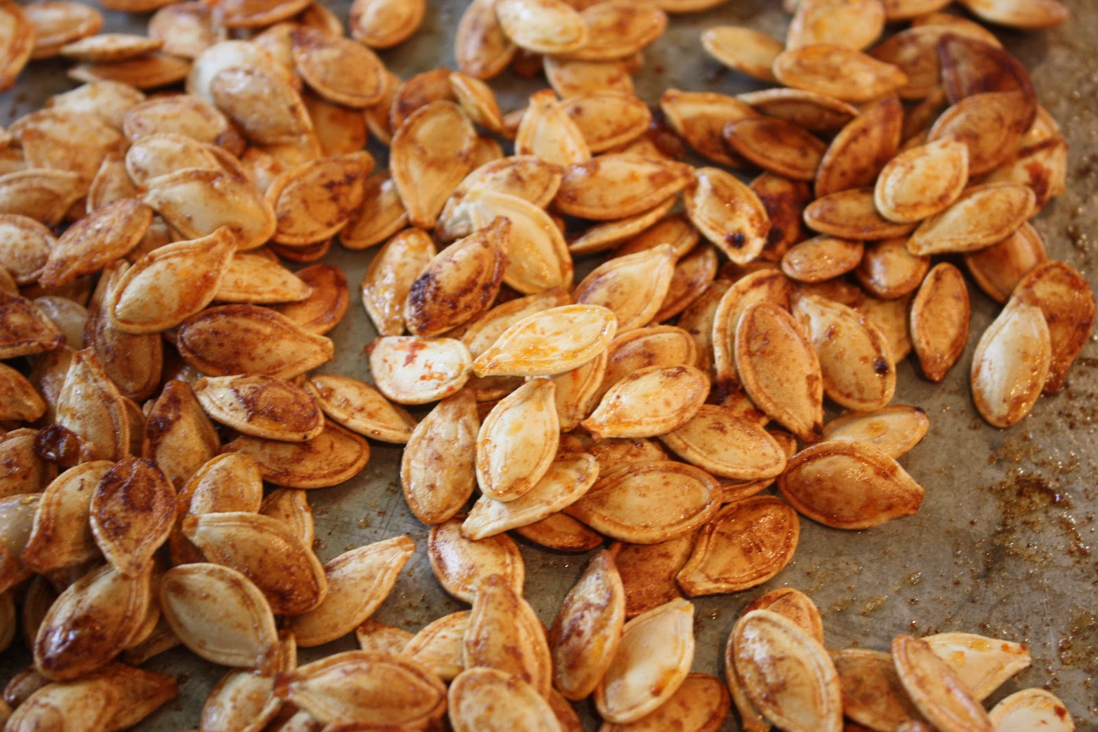 Gourds this time of year brings up a little story that may be shocking to some. It was a scandal around our neck of the woods a few years back. 6 years ago our family won the Cooking With Your Kids contest with the Food Network and a few weeks after the trip the local newspaper printed a story about us. (Here is a link to the article.) It was a full page article with a huge picture of our fam posing in our kitchen. The kids loved it! We didn’t realize though what was hanging on our fridge in the background of the newspaper photo. It was a picture from 14 years ago. The one to the right with Jimmy holding the gourds. Here it is. If it’s offensive………I am sorry, but we’ve always thought it was dang funny as you can tell by the look on our faces. Therefore we hung it on our fridge. It wasn’t front and center by any means, but it was visible up in the corner of the newspaper photo. Well a day after the Clawson family story ran, a call was made to the newspaper about the pornographic picture in the background of our story. The caller was disturbed that this kind of material was available for her/his children to view. It was in fact her/his 10 year old son who picked the picture out she/he said. The photographer called James laughing his guts out. He thought it was hilarious. We grabbed the article and low and behold there it was. The infamous picture of James holding my gourds. It was about the size of half a postage stamp, but someone was offended. The newspaper thought it was hilarious and ran quite a few editorial articles about the anonymous comment over the next couple of weeks. I wanted to stick my head in a hole and hide. It generated a lot of jokes, and customers thought it was great. The one thing that made me feel bad though was the fact that I didn’t know who thought the image was disturbing. Had it been someone who’d been in my home and seen the picture in person, or just a random newspaper reader. I have a feeling that it was someone we knew and that’s what stung. So I hope I don’t offend anyone with posting the disturbing photo. Still to this day, I get a little giggle every time I see it though. The picture no longer hangs on my fridge, but it has a special place in my home. So I guess James won’t be running for President of the United States. I just don’t think I could handle the press digging through my dirty laundry or squash patch, and finding this photo for the world to see. It would be a scandalous scandal if you know what I mean. So just enjoy the pumpkins seeds, and all the lovely gourds this season and don’t tell me if you hate the pic:) We’ll stay friends that way.Roasted Pumpkin Seeds